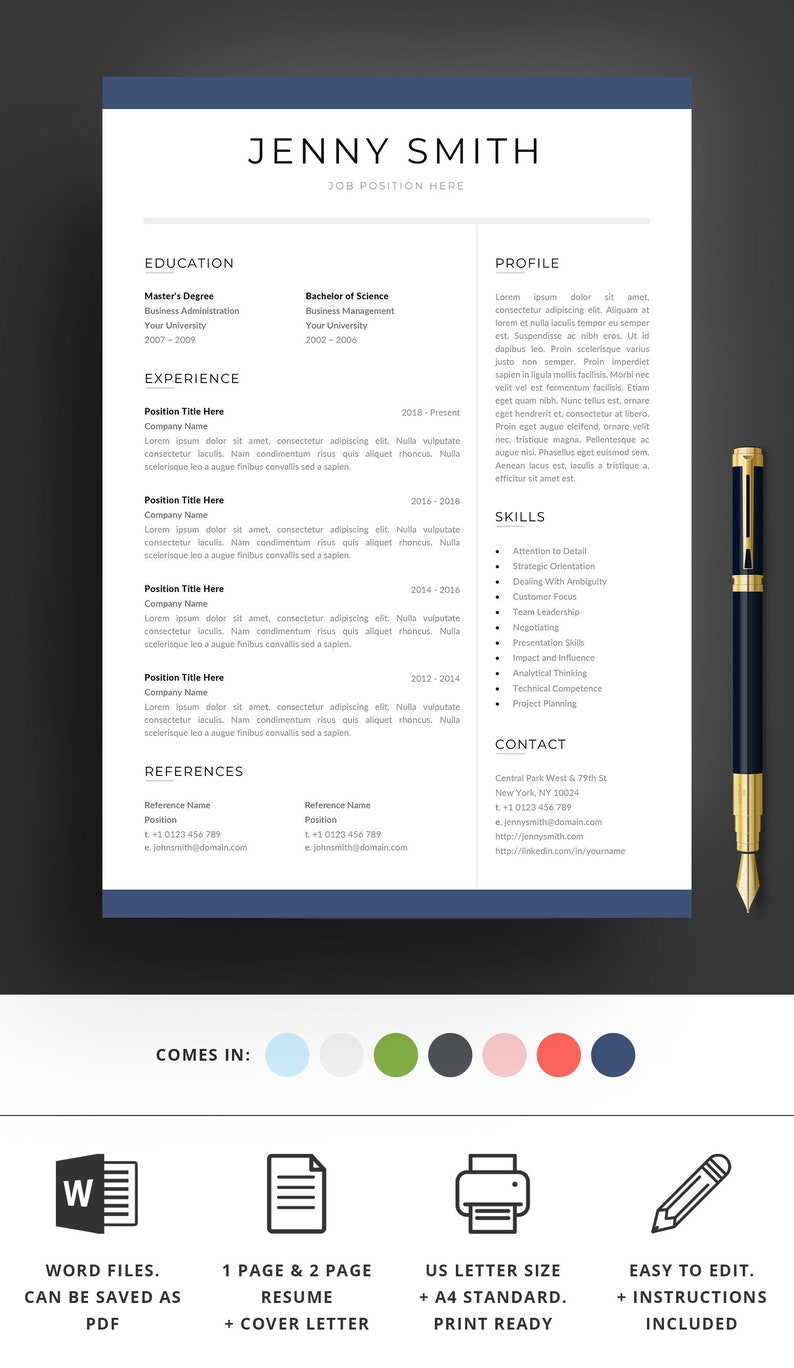 Resume Template Word Professional 1 Page Resume 2 Page Resume Modern Clean Creative Resume Cv Template Cover Letter Instant Download