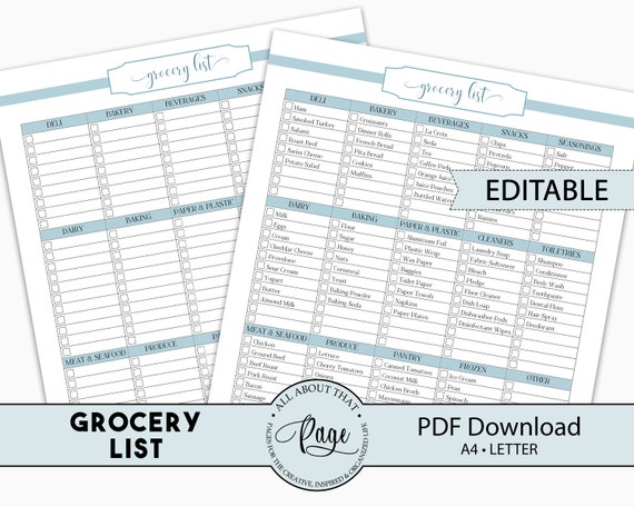 Editable Grocery List Printable Shopping List Template Customized Grocery List Pdf Download Blue Kitchen Organization Rmp02 02 Glp