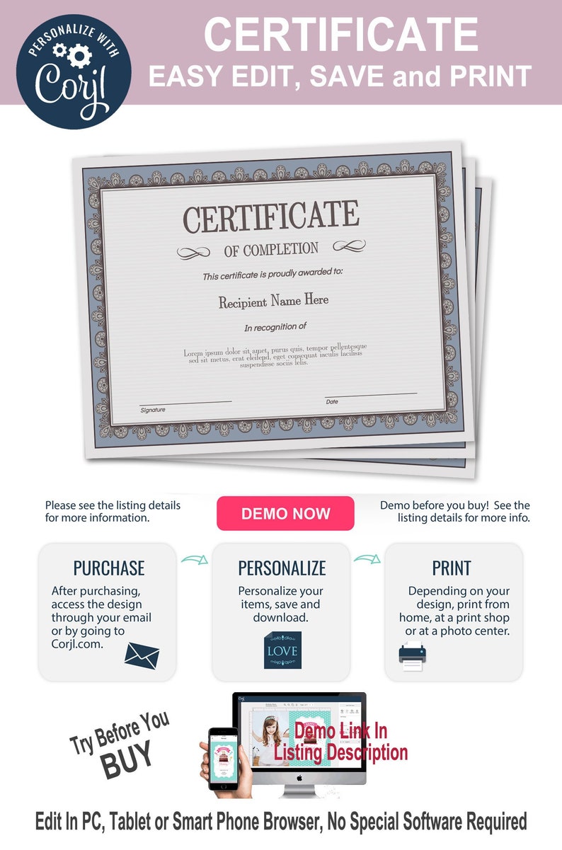 Certificate Of Completion Editable Template Printable Instant Download You Edit Template Diy Certificate Template Awards Diploma