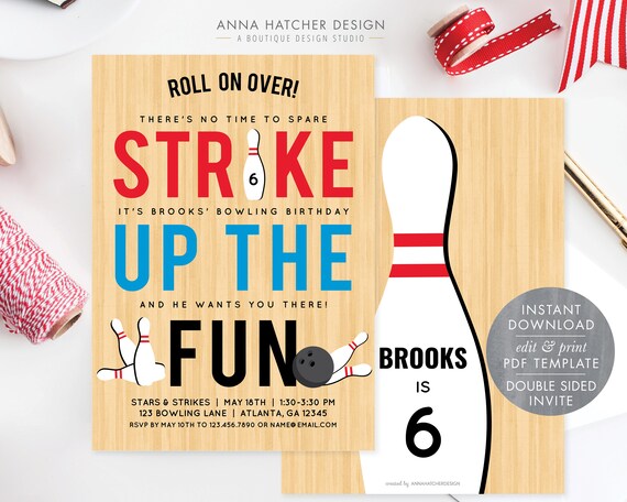 Bowling Birthday Party Invitation Bowling Party Invite Strike Up The Fun Bowling Pin Bowling Ball Any Age Editable Pdf Template Bday31
