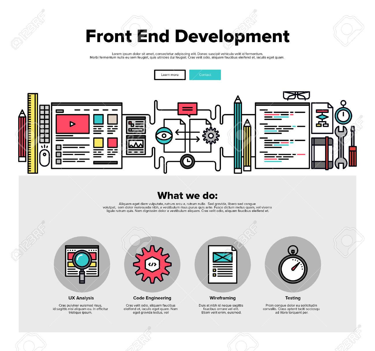 One Page Web Design Template With Thin Line Icons Of Front End