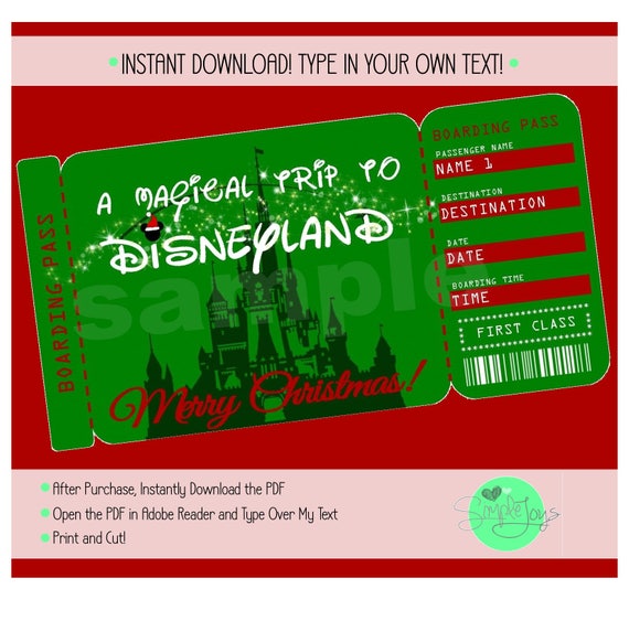Printable Christmas Surprise Ticket To Disney Disneyworld Disneyland Boarding Pass Template Digital File You Fill And Print