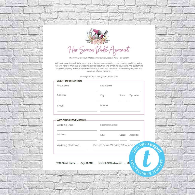 Hair Stylist Bridal Or Event Agreement Contract Template Templett Editable Printable Size 8 5x11 Mac Pc Instant Download