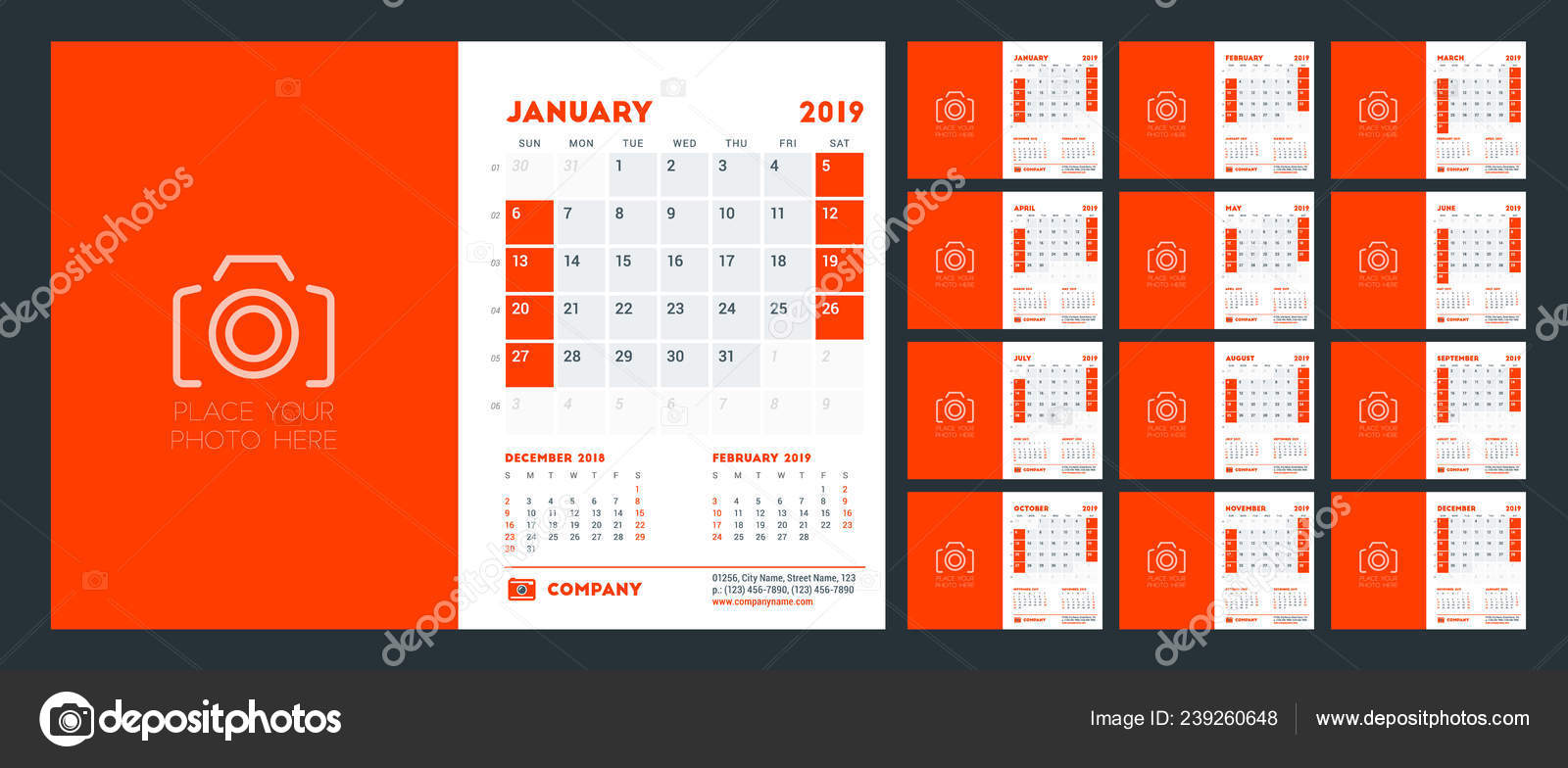 Desk Calendar For January 2019 Template Printable Calendar Planner Design Template Week Starts On Sunday Stationery Design Vector Illustration Stock