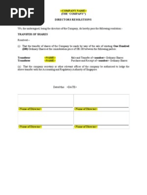 Resolution Of Transfer Of Shares Share Transfer Instrument
