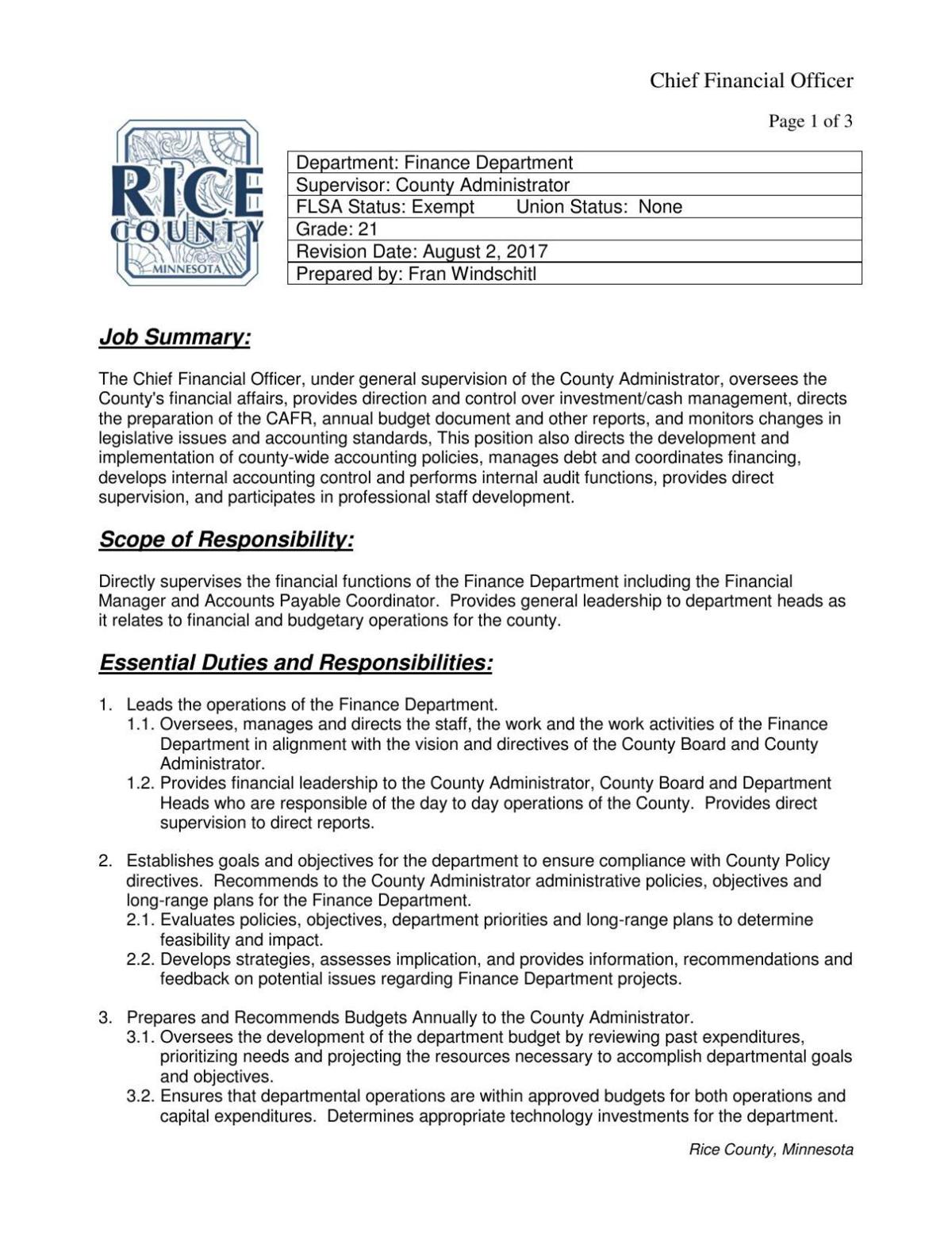 Chief Financial Officer Job Description Chief Financial