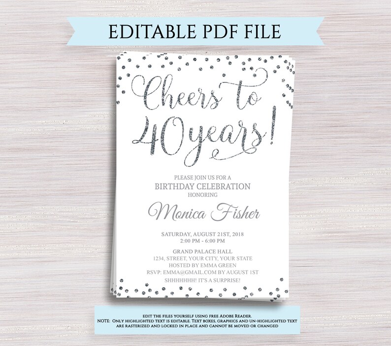 Editable 40th Birthday Party Invitation Template Cheers To 40 Years 40th Anniversary Silver Birthday Invite Digital Printable Pdf