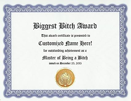 Biggest Bitch Award Personalized Custom Award Certificate For A Bad Friend Mean Family Member Annoying Co Worker Or Any Bitchy People In Your Life