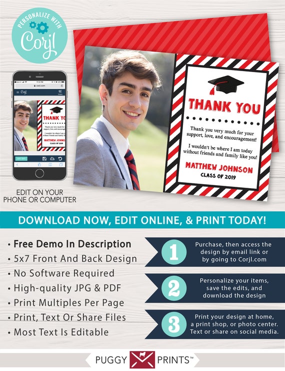 Graduation thank you card templates design personalized graduation thank you cards by drop photos of the graduate onto professionally designed templates and customized to your liking. These graduation thank you cards are all free and they can all be customized with text and photos before or after you print them. Thank them now while the smiles and hugs and well wishes are fresh in your memory.